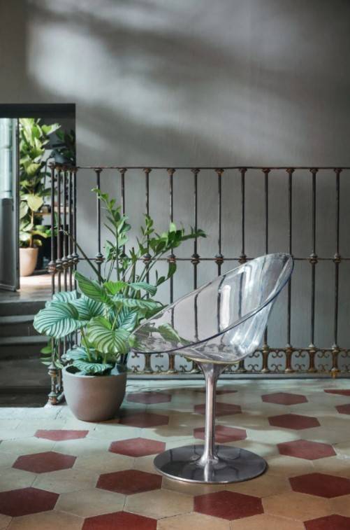 fauteuil pivotant Ero/S/ de Kartell symbolise aussi cet engouement pour la courbe raffinée, le polycarbonate et le métal chromé. Ses proportions permettent de l’installer dans un bureau, un bar ou un salon.
