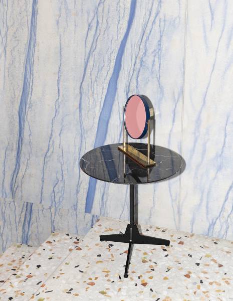l’emploi de matériaux comme le plastique ou le marbre. La table basse Hexa de Saba Italia allie un plateau rond ou ovale en marbre et un pied central en acier chromé. La veinure géométrique irrégulière de la pierre contraste avec le fini uni du socle.